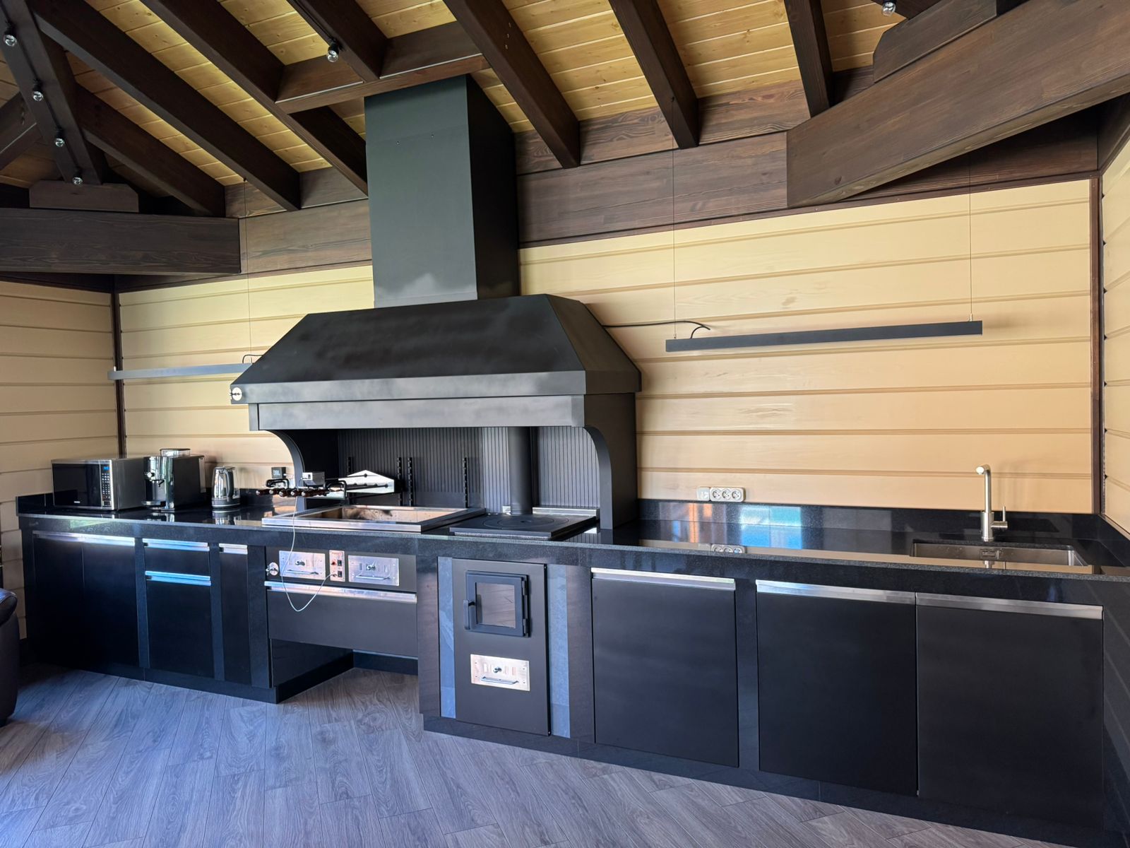 Комплекс выполнен в строгой черно-серой гамме. Столешница и панели шкафов изготовлены из гранита Абсолют Блэк, а дровница и печь для казана облицованы темно-серым сланцем. Фасады шкафчиков изготовлены из влагостойкой мебельной фанеры и покрыты долговечной мебельной эмалью.