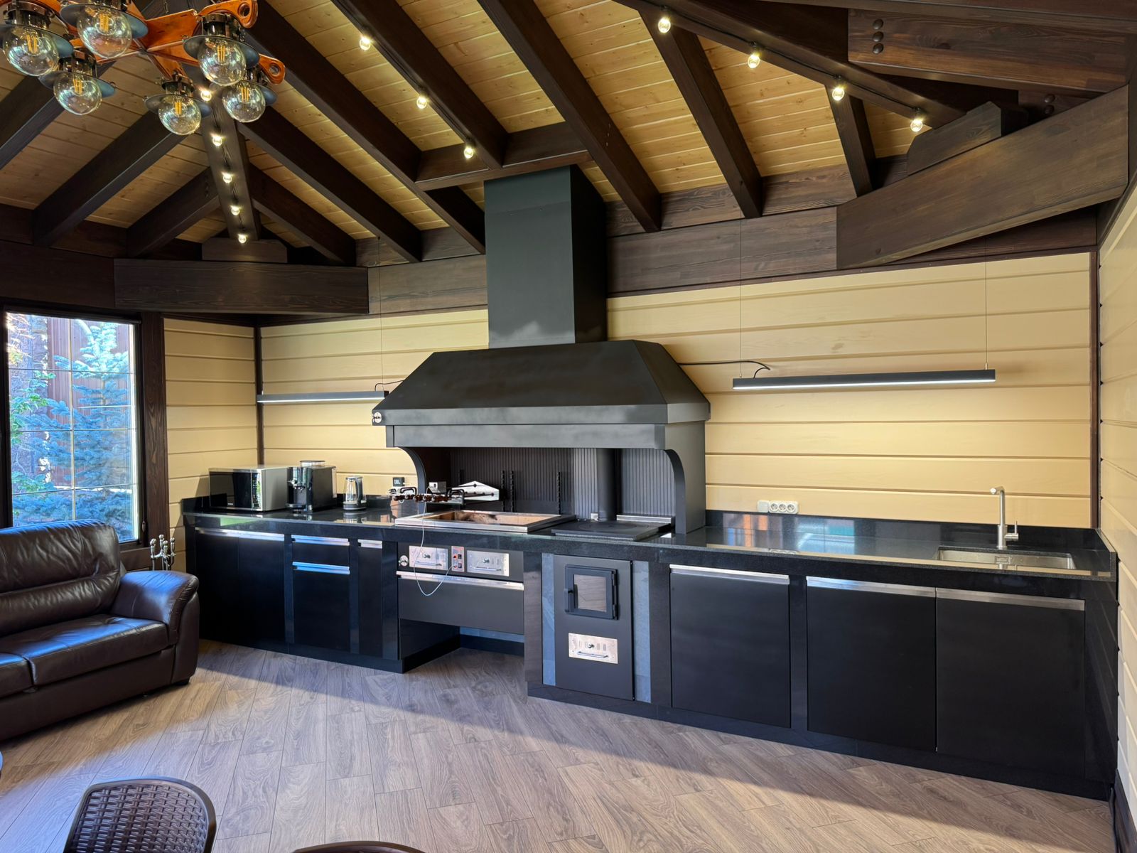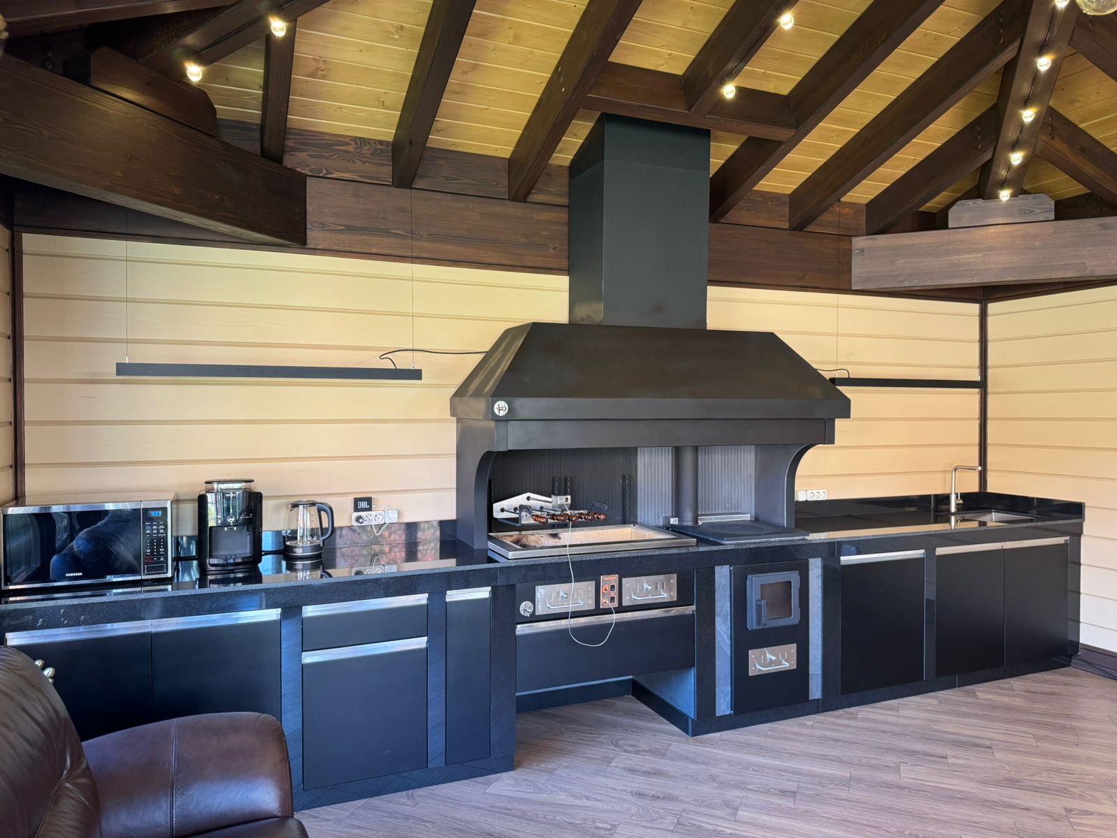 Этот комплекс установлен в закрытой беседке, спроектированной нашей командой, что гарантирует максимальный комфорт и функциональность, а также общую гармонию зоны барбекю.