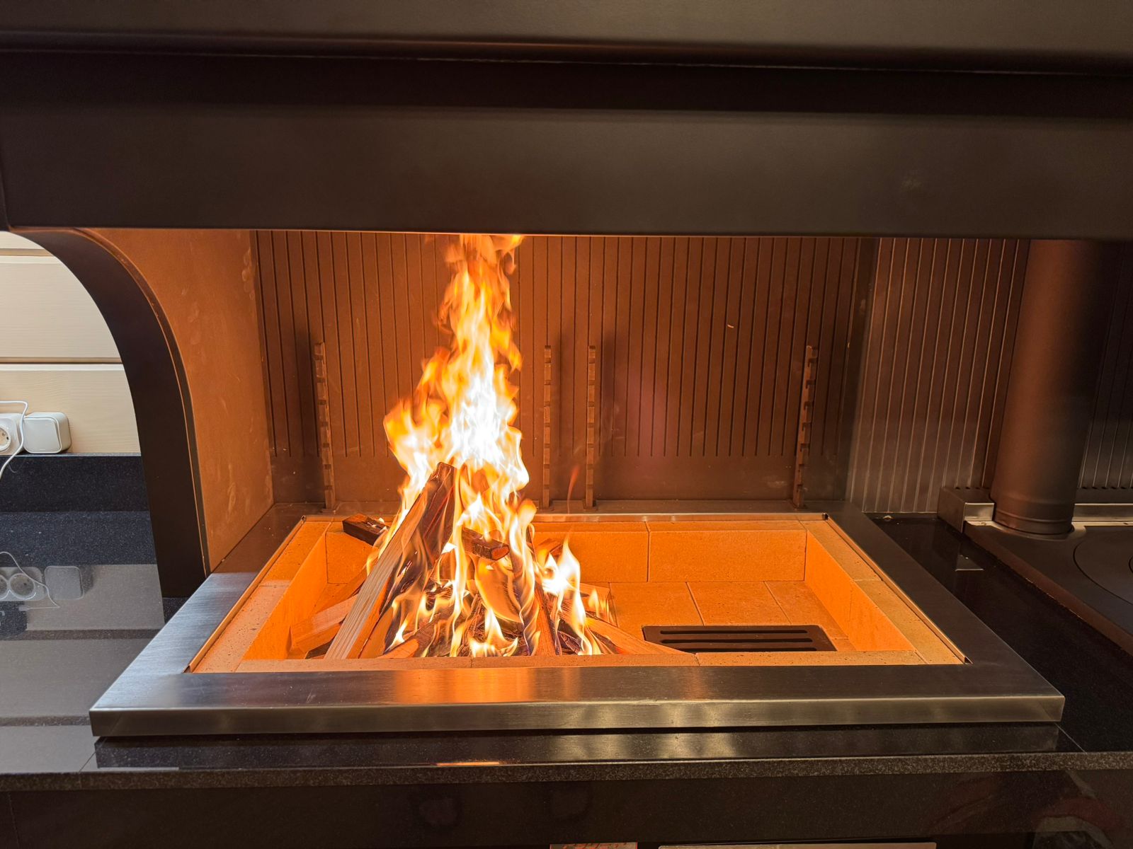 Дымоход из сэндвич-труб аккуратно скрыт декоративным металлическим коробом, обеспечивая и хороший внешний вид и дополнительную безопасность.